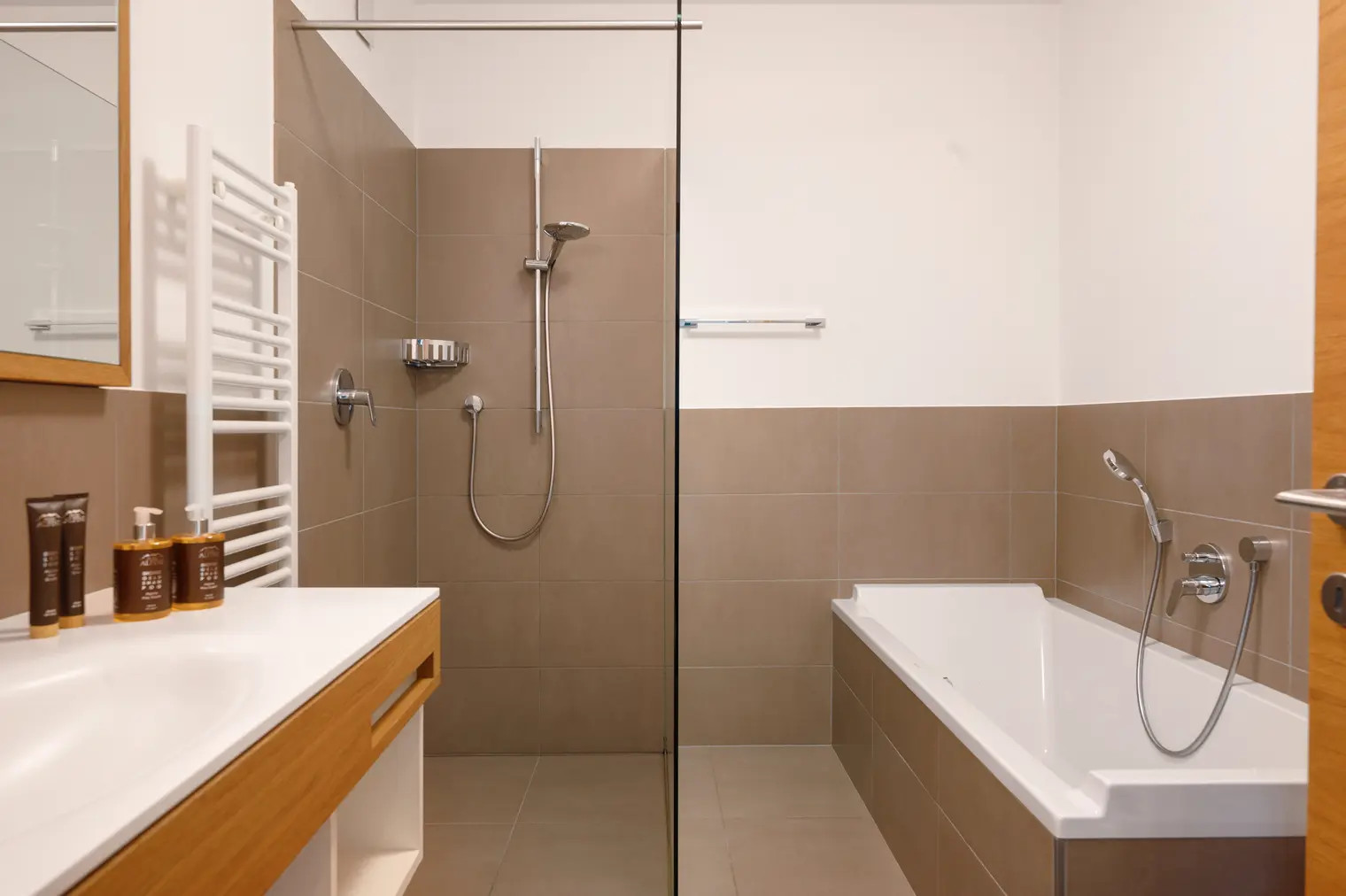Das Appartement MAXIMUS besticht nicht nur durch seine Größe. Auch die stilvolle und hochwertige Einrichtung lassen das Urlauberherz höher schlagen. Mit seiner voll ausgestatteten Küchenzeile läd es zum Kochen und Genießen ein, und es bleibt ihnen überlassen ob Sie Ihr Mahl an der gemütlichen Essecke oder in Ihrem Privatgarten zu sich nehmen. Ein weiteres Highlight ist das große Badezimmer samt Badewanne.